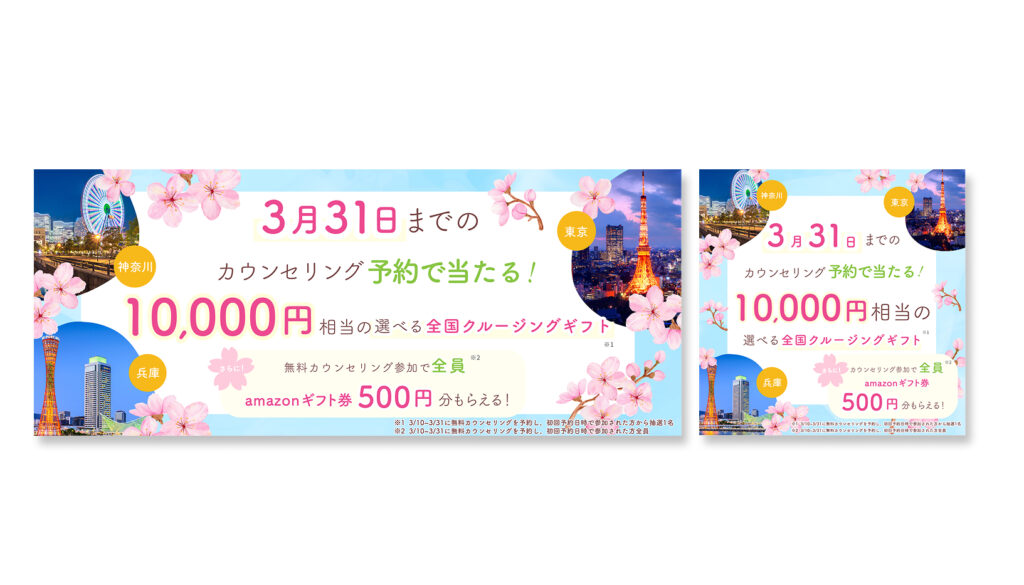 バナー制作 2025年10月9日 最終更新日時 : 2025年10月9日 mloreh2 【製作時間】3時間/1枚【使用ソフト】Photoshop・illustrator【担当業務】デザイン【意識した亊】春らしい季節感が伝わるデザインにしました。